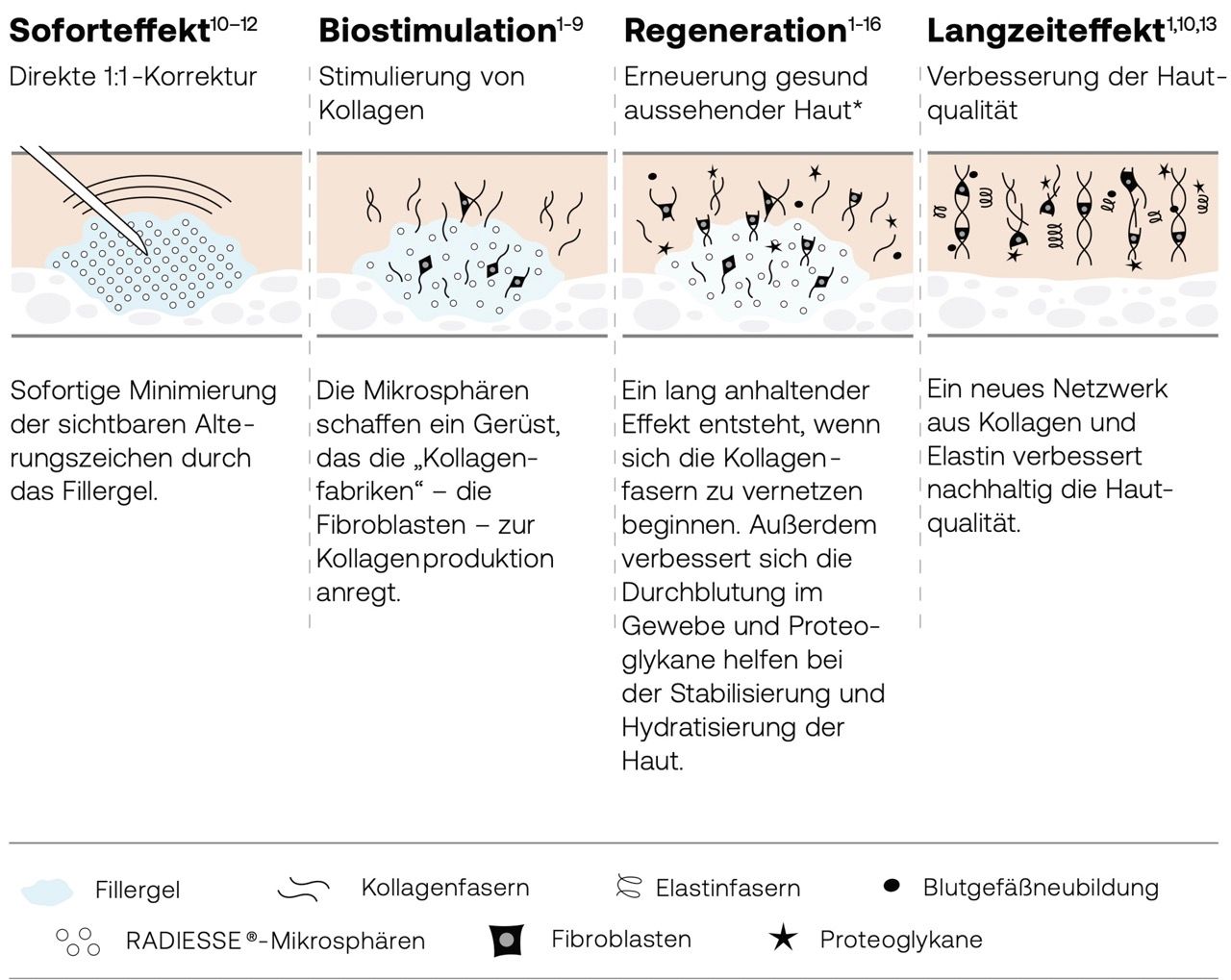 Radiesse ist ein wissenschaftlich belegter regenerativer Biostimulator, der direkt auf die Zellen in der Haut (z.B. Fibroblasten) einwirkt, um natürliche Bestandteile der Haut wiederherzustellen. Das führt nachhaltig zu einer Stabilisierung der Hautstruktur und kann sichtbaren Alterserscheinungen entgegenwirken.