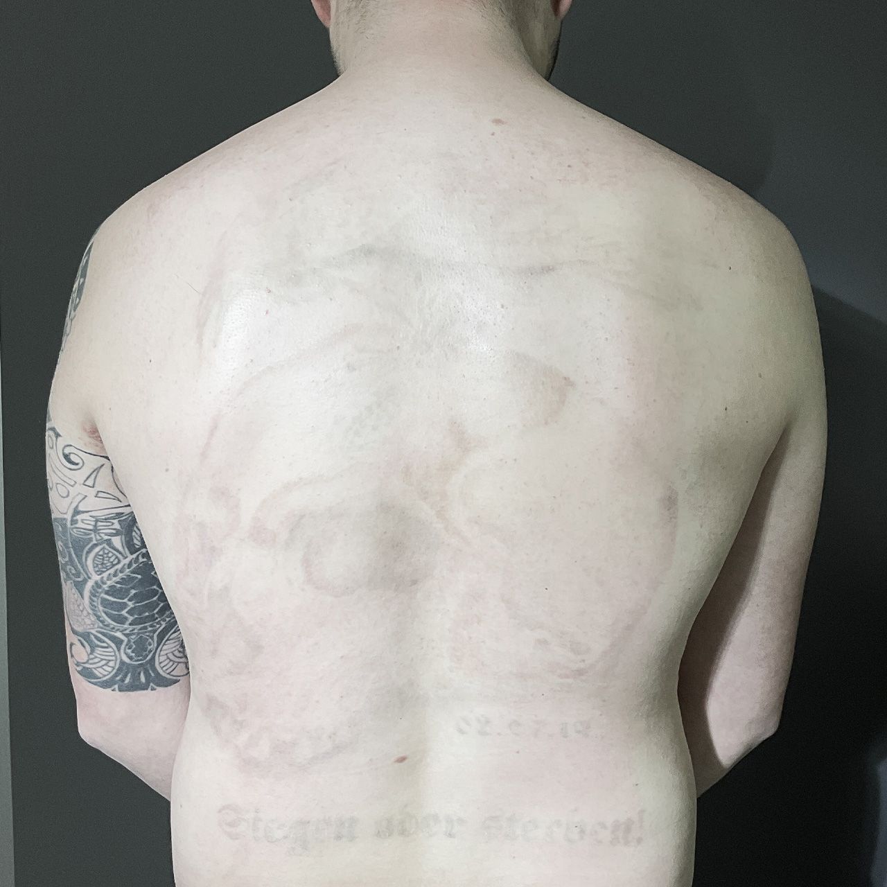 1. Fotodokumentation: Vor Beginn jeder Sitzung wird das Tattoo fotografisch dokumentiert, um den Verlauf objektiv nachvollziehen zu können.